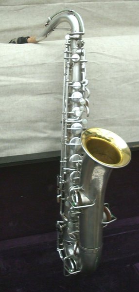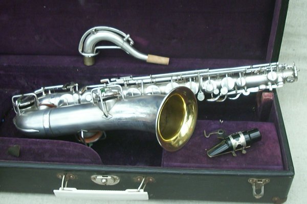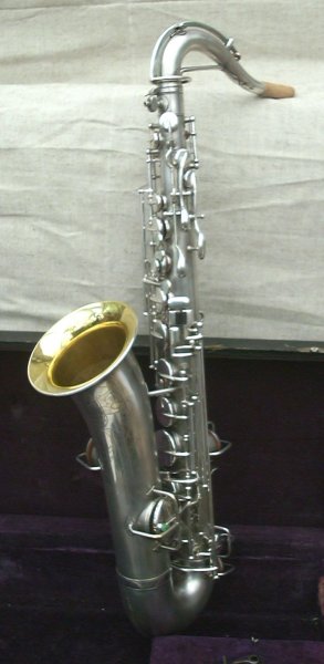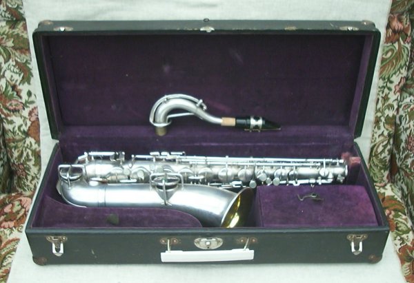 To hear a very basic (direct into the PC microphone) sound sample produced on the sax, please click here for the sound sample. Supplied with a used tenor sax mouthpiece, using normal tenor sax reeds, and a very functional period C-Melody case. The case is in good solid condition, considering it's 80 years old, with purple velvet (?) lining in remarkable state except for a some rubbing wear at one end. Two internal compartments, with lids, and the case has working catches, plus a replacement handle ( touch of Art Deco...? ).