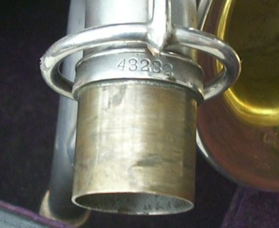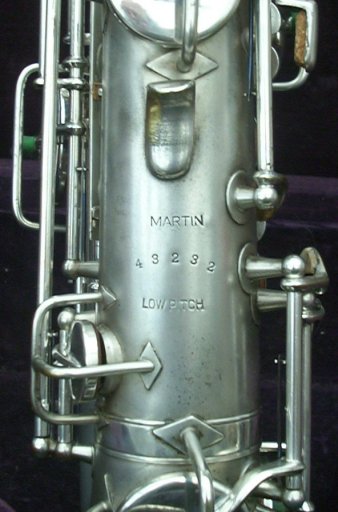 The serial number is 43232. The neck also has the same serial number. Marked 'Low Pitch', which signifies standard, modern, A=440 pitch, so it plays in tune with modern instruments. Has the classic beveled tone holes, unique to Martin, and was manufactured in Elkhart, Indiana, USA around 1924-25. The matt/satin silver body, bright silver detail and keys, and gold-wash bell have all been recently hand polished, making this a very desirable saxophone. Mother-of-pearl key touches on the finger keys, and I can't see any signs of damage or repairs - just a very minimal amount of finish wear, typical of a well cared-for, and obviously played, vintage sax.