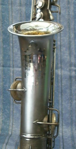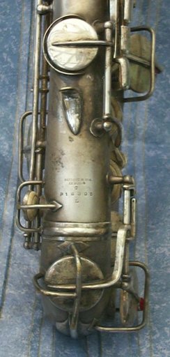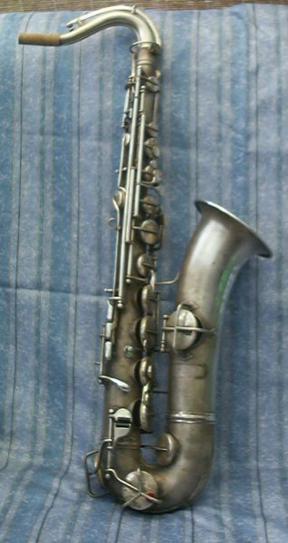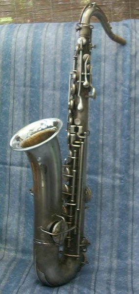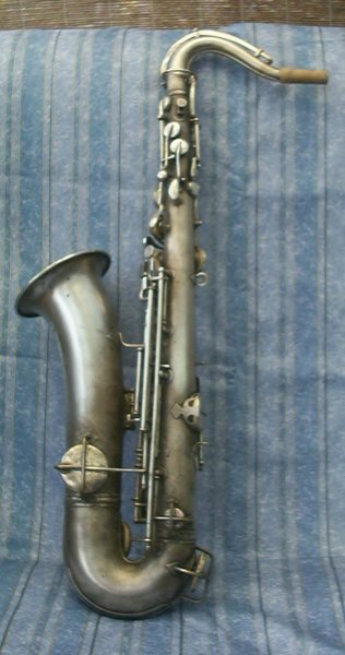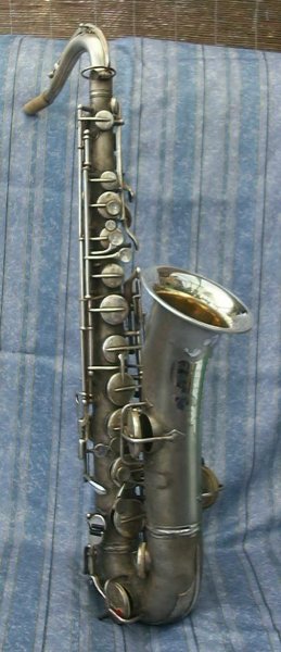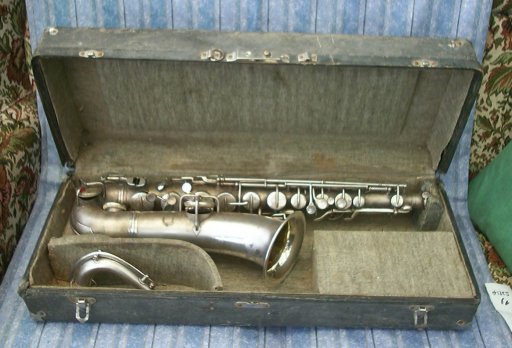 With fitted case in poor condition, but also with potential for refurbishment. Sax finish is brushed-silver body, with bright-silver action and bell engraving - only the neck and part of the bell have been cleaned to show the potential of this magnificent vintage sax.