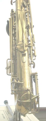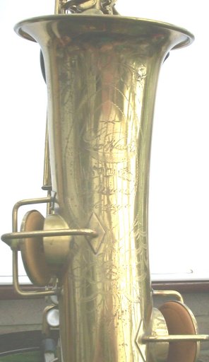The pictures below have been taken with natural lighting to try to best show the features of this classic instrument - in reality the colour of the lacquer is a deeper gold. Some reflections and shadow show in the lacquer, it's not all wear ! The mouthpiece shown is my old Couf, used to test the sax - the mouthpiece supplied is new, unused except for a quick test and to record the sound sample.