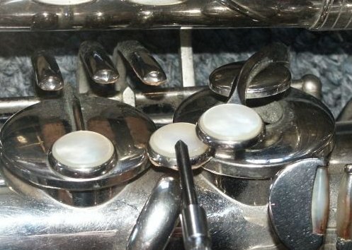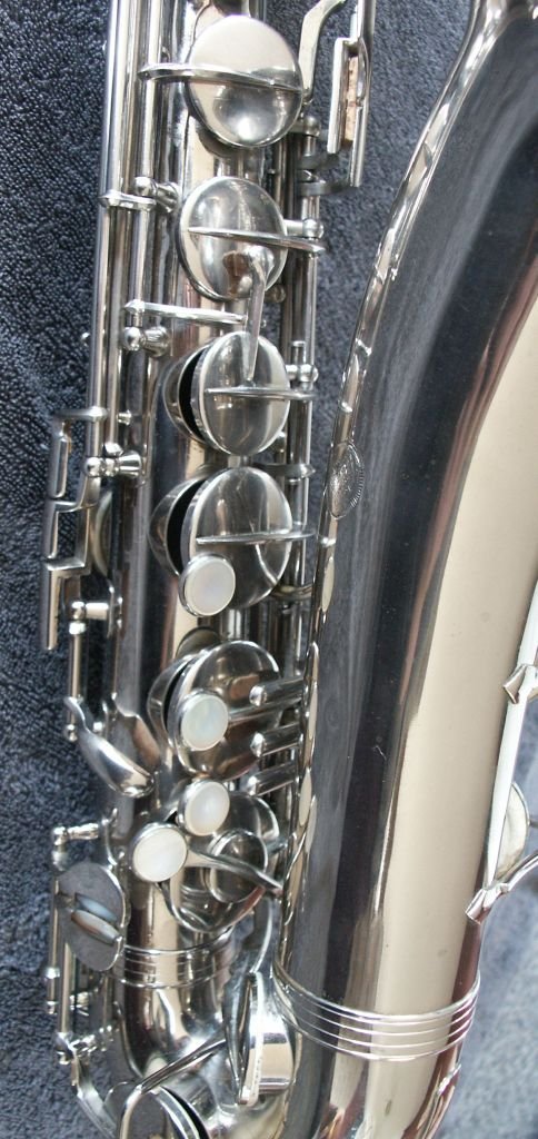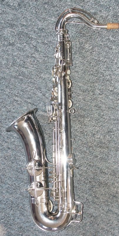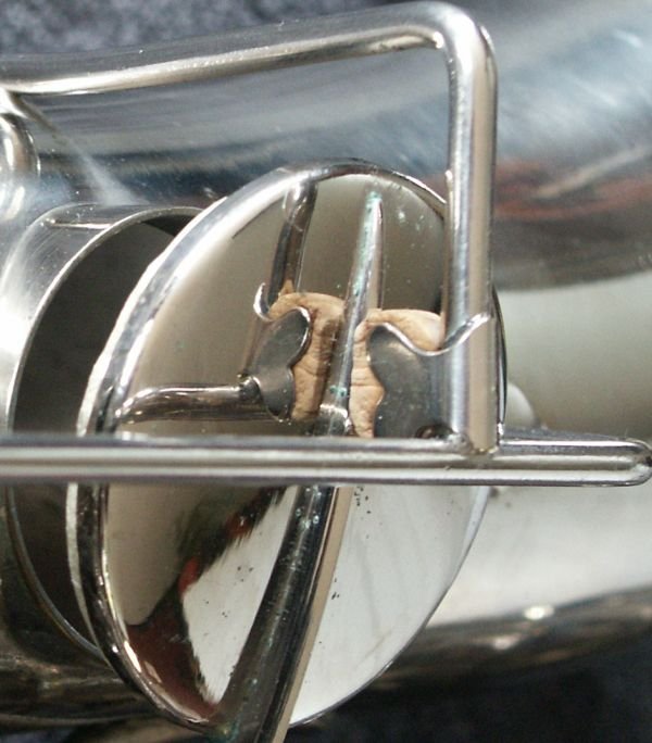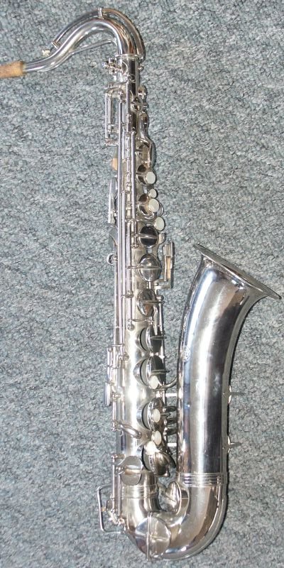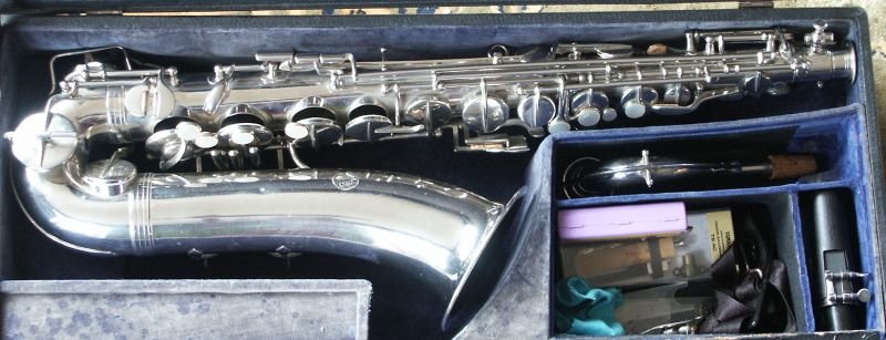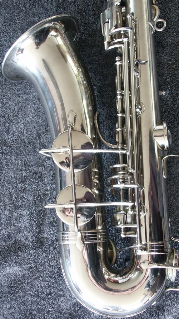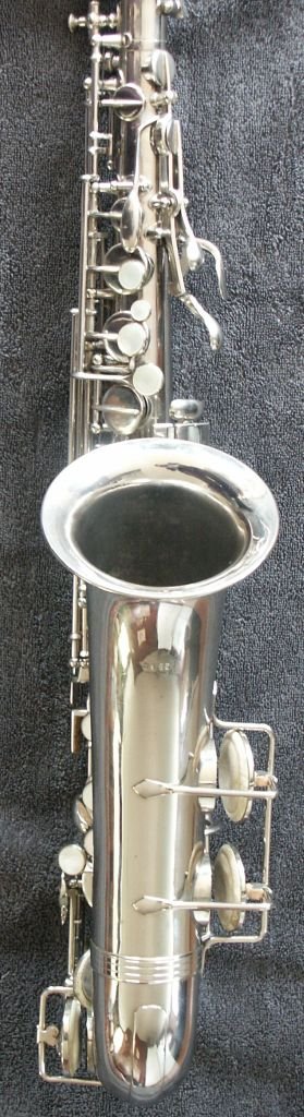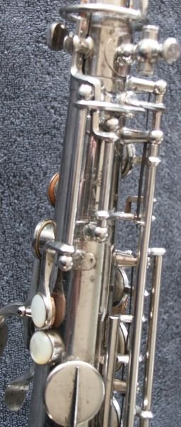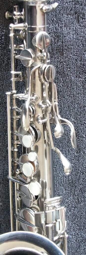 Nickle Plated, many superb features, including - a) left-hand 'pinkie' keys duplicated above right-hand action (see bottom-middle photo in the first group of four) b) same photo also shows 'pearl low-D/Eb-trill keys' - the last two features are also seen on some Buffet C-Mels c) spatula 'Alt-front-F' key d) low B and Bb on same side of the bell e) Martin/Holton style neck brace, which extends to almost the total neck length f) very effective cup bumper clips g) note the very appropriate lack of engraving, just the classic Oscar Adler & Co stamp h) soldered toneholes i) and just look at that functional case........